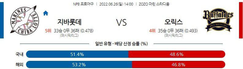 리그 최고의 완성형 에이스 야마모토 요시노부 투수의 8이닝 무실점 역투 속에 4-0 승리로 4연승에 성공한 오릭스 이지만 최근 야마사키 사치야 투수의 행보가 불안하다는 것에 베팅 포커스를 맞춰야 하는 경기다. 또한, 오릭스와 시리즈에서 2경기 연속 무득점으로 침묵하고 있는 지바롯데 타선이지만 미마 마나부 투수가 마운드에 올라오는 경기에서는 활발한 공격력을 보여준 기분 좋은 징크스를 최근에 보여주고 있다는 것을 체크해야 한다. 지바롯데 승리 가능성을 추천 한다.
