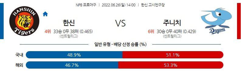 전일 경기 0-10 패배로 시리즈 2연패, 시즌 4연패에 빠진 주니치라는 것이 주력 승부를 제외하게 만들지만 선발 싸움에서 공이 긁히는 경기에서는 끝까지 가는 모습을 보여준 야나기 유야 투수가 한수 위에 있다고 생각 되는 경기다. 주니치 승리 가능성을 추천 한다.