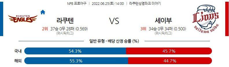 선발 싸움에서 가라시마 와타루 투수에 대한 기대치가 높고 전일 경기에서 상대 보다 4개가 더 많은 10안타 경기를 하고서도 3-4, 패배를 당한 라쿠텐 타선이 잔루를 많이 남기는 똑같은 실수를 되풀이하지는 않을 것이다. 라쿠텐 승리 가능성을 추천 한다.