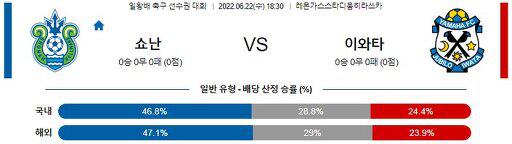 양 팀의 최근 5차례 맞대결 중 4번의 언더(2.5 기준)가 나온 점, 양 팀 주소모두 3백을 사용하며 역습을 주로 노린다는 점을 고려하면 언더(2.5 기준)의 가능성이 높겠다. 또한 후술하겠지만, 쇼난은 시즌 초반 부진을 겪었으나 최근 들어 분위기를 회복했다. 반면 이와타는 시즌 초반에 비해 패배 비율이 늘었다. 득, 실 기록 주소모두 좋지 않은 상황. 직전 두 차례의 컵대회 맞대결에서도 주소모두 쇼난이 승리를 거둔 바 있다. 이번 일정도 더욱 저자세인 쇼난의 승리가 예상된다.