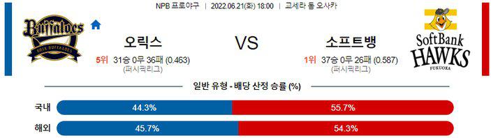 주말 세이부와 시리즈에서 1승2패, 루징 시리즈를 기록한 오릭스 이지만 6월 0.358의 고타율을 기록중인 스기모토는 2개 홈런을 쏘아올리며 뜨거운 타격감을 유지하고 있는 모습 이였다. 안방으로 돌아오는 만큼 오릭스 타선의 생산성이 올라올 것으로 예상되며 직전경기에서 5연승이 중단 되는 패배가 나왔지만 구위 자체에 큰 이상 징훅 포착 되지 않은 미야기 히로야 투수가 선발 싸움에서 우위에 있는 경기다. 오릭스 승리 가능성을 추천 한다.
