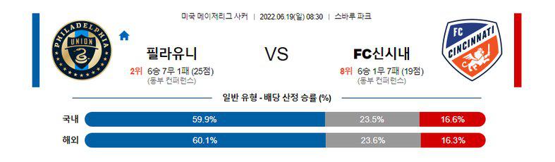 필라델피아가 최근 실점이 잦은 점, 신시내티가 언급한 적극적인 기조를 유지해 최근 4경기 연속 오버(2.5 기준)를 기록한 점을 고려하면 오버(2.5 기준)의 가능성이 높겠다. 또한 후술하겠지만, 필라델피아의 순위가 더 높으나, 최근 극도의 저자세 경기 운영으로 승리를 따내지 못하고 있다. 최근 8경기에서 6무를 기록 중. 신시내티는 이와 반대로 적극적인 기조를 시즌 내내 유지하고 있기 때문에 상대적으로 전력이 약할지라도 이번 일정에서 무승부의 확률이 높겠다. 무승부 / 오버(2.5 기준)를 추천한다.