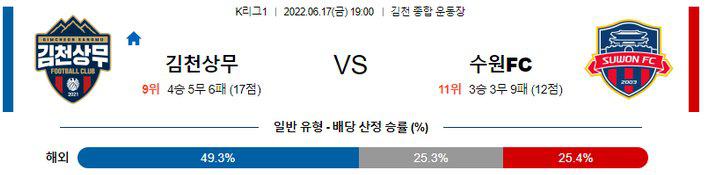 양 팀 주소모두 A매치 휴식기 전 득, 실점이 많았던 팀으로 김천은 직전 5경기 중 3경기에서 오버(2.5 기준)가, 수원은 직전 6경기 중 5경기에서 오버(2.5 기준)가 나온 점을 고려하면 오버(2.5 기준)의 확률이 높겠다. 또한 양 팀 주소모두 최근 흐름이 좋지 않지만, 김천은 중원과 공격 쪽에 국가대표팀에서 활약을 하고 돌아오는 선수들이 있기 때문에 해당 전력들의 자신감에 차 있는 상태. 국내에서 치른 평가전이기 때문에 체력적인 부담도 그리 크지 않을 것으로 보인다. 반면 그에 반해 별 다른 반전의 카드가 없는 수원이기 때문에 김천의 승리가 예상된다. 김천이 그래도 홈에서는 승리가 더 많다는 사실도 참고하면 좋다.