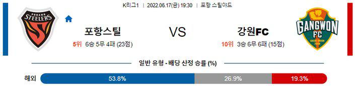 여기에 강원은 원정에서 단 1승도 거두지 못하고 있는 상황. 포항이 홈에서 6경기 3승 2무 1패를 기록하며 나름대로 좋은 모습을 보여주고 있기 때문에 이번 원정 일정도 승리의 가능성은 매우 낮겠다.
