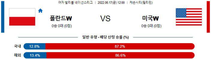 폴란드가 태국과 혈전을 치른지 얼마 지나지 않고 미국을 상대해야 해서 굉장히 일정 상 힘든 상황이다. 그것도 미국은 하루를 쉬었기에 체력적인 여유가 또 있는 상태다. 전력 차이도 있는데 체력 차이까지 있어 이 경기는 미국의 승리를 먼저 봐야 되며, 셧아웃 승리 가능성도 높아 -2.5세트 핸디캡 승리까지 같이 봐야 한다. 언오버 기준점이 150.5점인데, 3세트 기준점 치고는 많이 높아서 언더부터 봐야 한다.