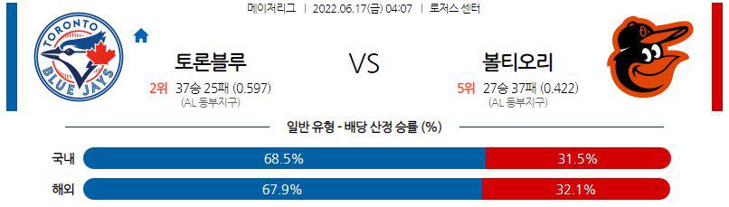 토론토의 승리를 본다. 볼티모어의 맹추격에 연장을 허용했지만 게레로 주니어의 끝내기로 승리한 토론토의 기세가 대단하다. 또, 팀에서 가장 믿을 수 있는 에이스 가우스먼의 등판이기에 볼티모어 타선을 막아낼 수 있을 것이다. 가우스먼이 볼티모어에서 전성기를 시작한 투수기에 팀 타선에게 동료로써 낯선 투수이기도 하다.