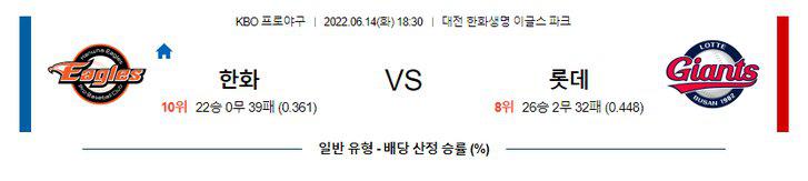 4연패에 빠진 한화의 불안한 수비와 투타의 엇박자 현상에 우선적으로 베팅 포커스를 맞춰야 하는 경기다. 또한, 롯데는 일요일 KT와 홈경기에서 13-0의 기분좋은 승리로 연패를 끊어낸 상황. 롯데 승리 가능성을 추천 한다.