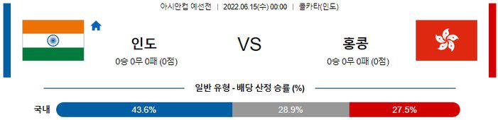 홍콩도 본 대회에서 꾸준히 득점을 터뜨리고 있기 때문에 1골정도의 가능성은 있으며, 인도도 2경기 연속 멀티 득점을 터뜨리고 있다. 다득점 페이스로 오버(2.5 기준)의 가능성이 높겠다. 또한 양 팀 주소모두 아시아 지역에서는 약체로 분류되지만, 인도는 남아시아 지역에서 최강자 수준으로 평가받으며, 하위 레벨의 팀들은 확실하게 잡아낼 수 있는 능력이 있다. 여기에 인도는 호날두, 메시에 이어 현역 선수 중 가장 A매치 득점을 많이 터뜨린 선수인 체트리를 보유하고 있다. 이번 아시안컵 예선 일정이 인도에서 열린다는 점도 호재. 홈 팀 인도가 승리를 거둘 것으로 보인다