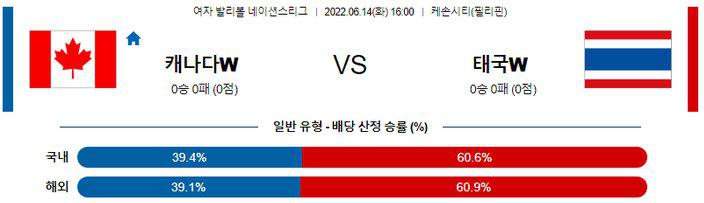 공격에서 다양한 옵션을 가져갈 수 있는 쪽은 태국이라 할 수 있다. 뽄뿐의 세팅이 기대 이상인데다 핌피차얌 코크람과 찻추온 목스리, 아챠라폰 콩욧 등 다양한 공격수들을 자랑하는 태국이라서 공격 옵션 쪽에서는 태국이 유리할 전망. 캐나다는 반 라이크와 그레이의 득점 비중이 커 아무래도 공격 쪽에서는 한계가 있다. 태국의 승리를 예상하나, 태국이 이번 대회 5세트를 굉장히 많이 갔고, 캐나다가 높이에서는 우위여서 또 한 번 풀세트 접전 가능성이 있다. 핸디캡은 +1.5세트를 받은 캐나다를 보자. 언오버 기준점이 183.5점인데, 5세트라면 이 점수는 거의 넘는다. 오버를 봐야 한다.
