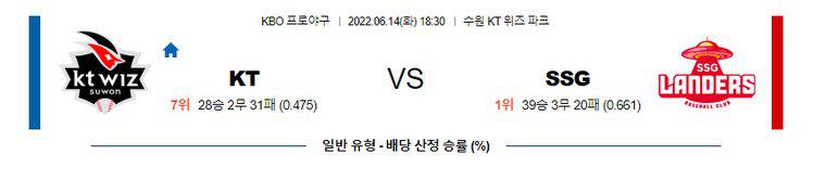 홈에서는 6경기 2패, 5.11을 기록중인 이태양 투수 이지만 원정에서는 난공불락의 모습을 보여주고 있고 타선의 기대치에서 SSG의 손을 들어줄수 있는 타이밍. 소형준 투수는 올시즌 상대전 SSG 좌타자와 승부에서 고전하는 모습이 나타났다. SSG 승리 가능성을 추천 한다.