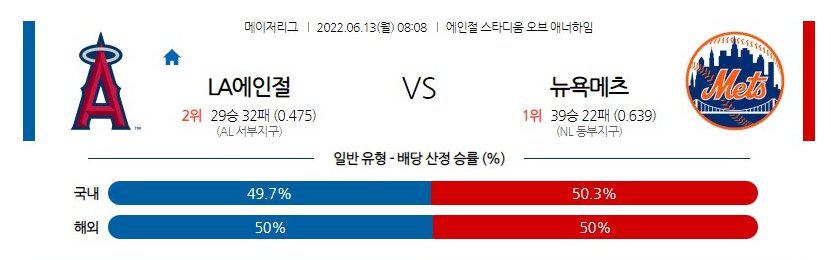 뉴욕 메츠의 승리를 본다. 에인절스가 믿기 어려웠던 14연패를 당하며 최악의 현재를 보냈지만 이번 시리즈에서는 나아진 타격으로 승리를 따내고 있다. 그러나, 큰거가 나오지 않으면 워커에게 끌려다닐 수 있다. 린도어와 맥닐 등 언제든 컨택으로 해결할 수 있는 타자들이 즐비한 뉴욕 메츠가 일요일 패배를 리벤지할 것이다.