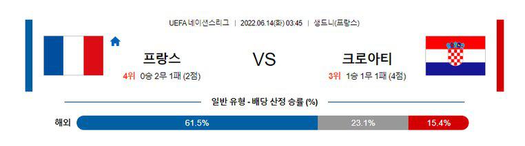 양 팀 주소모두 전방 쪽에 좋은 전력들을 보유하고도 본 대회에서 많은 득점을 기록하지 못하고 있기 때문에 이번 일정은 언더(2.5 기준)의 가능성이 높겠다. 양 팀 주소모두 앞선 2경기에서 언더(2.5 기준)가 나온 점도 참고하면 좋다. 또한 후에 언급하겠지만, 프랑스는 3경기째 유럽 네이션스리그에서 승리가 없다. 디펜딩 챔피언의 자존심을 제대로 구기고 있는 상황. 여기에 전력 누수도 있는 편이기에 이번 일정도 반전을 노릴만한 여지가 보이지 않는다. 크로아티아의 중원을 상대로 우위를 점하지 못할 가능성이 높기에 온전한 승점 3점을 얻는 데에는 어려움이 따를 것. 무승부 / 언더(2.5 기준)를 추천한다.