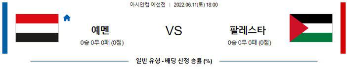 팔레스타인의 우위를 점친다. 월드컵 예선에서 일격을 당한 적도 있기는 하나, 수적 열세 없이 맞붙었던 마지막 대결에서는 깔끔하게 승리를 거둔 바 있다. 난민 3세 선수들을 대거 수혈해 전력을 크게 강화했으며, 이를 고려하면 팔레스타인이 주도적인 경기를 펼칠 가능성이 높다. 다만 예멘 역시 끈끈한 수비를 바탕으로 상위 전력인 필리핀을 상대로 선전한 바 있어, 다득점 페이스는 가능성이 낮다.
