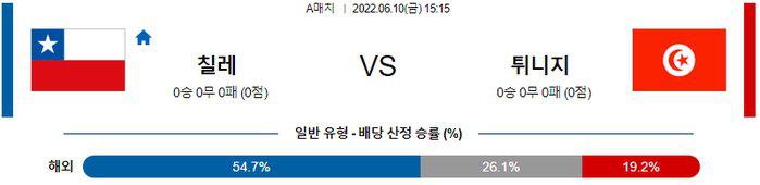 양 팀 주소모두 주포가 빠진 상황에서 이렇다 할 득점원이 없는 공통점을 고려했을 때 저득점 페이스가 될 전망. 언더(2.5 기준)의 가능성이 높겠다. 여기에 양 팀 주소모두 최근 분위기가 썩 좋지는 않다. 칠레는 월드컵 본선 진출해 실패했으며, 이번 일정에도 주요 선수들이 대거 빠진 상태. 또한 튀니지도 아프리카 네이션스컵 탈락으로 감독을 교체했는데, 꾸준한 경기력을 유지하지 못하는 중. 때문에 이번 일정은 승부의 추가 어느 한 쪽으로 기울어지지 않을 것으로 보인다. 무승부를 예상한다.