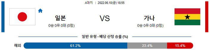 일본이 피지컬이 뛰어난 가나의 중원을 상대로 다소 어려움을 겪을 것으로 판단되며, 그에 따라 일본 특유의 축구를 구현하는 데 어려움을 겪을 전망. 때문에 저득점 페이스가 유력하다. 언더(2.5 기준)의 가능성이 높겠다. 또한 후술하겠지만, 가나도 화려한 선수단 면면에 비해 결과를 내지 못하고 있는 중. 아도 감독이 지휘봉을 잡고도 큰 변화가 이루어지지 않고 있다. 반면 일본은 앞선 경기에서 파라과이를 잡아내고 브라질과 접전을 펼치며 기세가 한껏 오른 상황. 여기에 이번 경기는 일본의 홈에서 진행되기 때문에 일본의 신승이 예상된다.