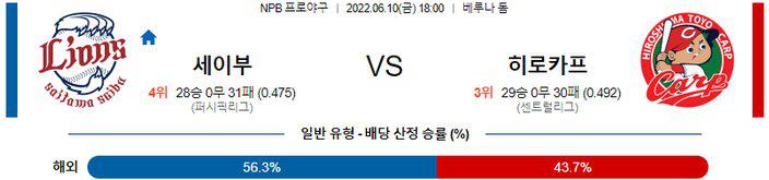 승운이 없을뿐 최근 2경기 연속 7이닝 1실점 투구를 기록한 다카하시 코나 투수가 선발 싸움에서 우위에 있고 전일 경기 요미우리와 홈경기에서 3-4, 패배를 당했지만, 8,9회 추격의 득점을 뽑아냈다는 것이 금요일 경기에서 세이부 타선에게 긍정적인 요소로 작용할 것이다. 세이부 승리 가능성을 추천 한다.