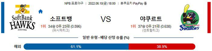 홈과 원정에 따른 투구내용에 차이가 발생하는 오가와 야스히로 투수 보다는 재충전을 시간을 보낸 이후 직전경기에서 구위에 힘이 부활한 센가 고다이 투수가 선발 싸움에서 우위에 있다. 소프트뱅크 승리 가능성을 추천 한다.