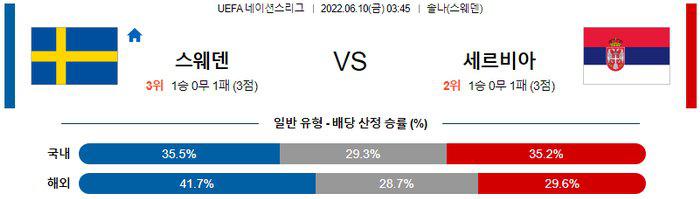 후술하겠지만, 스웨덴은 최근 부상, 은퇴 등의 이유로 A매치 성적이 좋지 않다. 이번 일정도 수비쪽 부상자가 너무나도 많아 수비 구성이 어려운 상태. 반면 세르비아는 직전 경기에서 주전 선수들 대부분 로테이션을 돌리며 실리와 휴식 두 마리 토끼 주소모두 잡은 상황. 세르비아가 기세를 이어나가 승리를 거둘 것으로 보인다. 또한 마찬가지의 이유로 스웨덴의 실점 가능성은 다분히 높으며, 직전 경기에서 양 팀 주소모두 오버(2.5 기준)를 기록했기 때문에 이번 일정도 오버(2.5 기준)의 가능성이 높겠다.