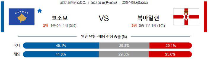 양 팀 주소모두 최근 3번의 A매치에서 주소모두 언더(2.5 기준)를 기록하고 있는 점을 고려하면 언더(2.5 기준)의 가능성도 높겠다. 또한 코소보가 홈 이점과 좋은 기세로 인해 정배를 받은 경기이나, 직전 경기에서 두 명의 퇴장과 주력 선수들의 부상으로 인해 전력 누수가 있는 편이기 때문에 승리까지 기대하지 않겠다. 여기에 북아일랜드도 강력한 5백을 바탕으로 수비에 치중하지만, 공격은 매우 무딘 상태. 언급한 이유를 종합해 봤을 때 무승부가 적합한 선택지라고 판단된다.