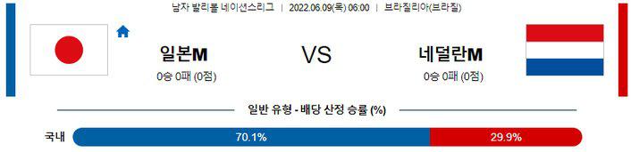 쉽게 승부는 안 날 경기다. 팀의 견고함은 일본이 앞선다. 나름 뛰어난 쌍포 니시다와 이시카와를 보유한데다 수비가 견고한 팀이라는 점이 있다. 하지만 에이스 파워와 높이는 네덜란드가 우위를 가져갈 확률이 높다. 압델 아지즈 급 공격수가 없다는 점, 높이에서 밀려 일본이 고전할 요소는 충분해 보인다. 결국 5세트 경기를 봐야 할 듯하며, 승자는 견고함이 있는 일본이 될 확률이 높아 보인다. 단, 네덜란드에 슈퍼 에이스급 선수가 있어 핸디캡은 +1.5세트를 받은 네덜란드를 생각하는 것이 좋겠고, 5세트 접전이므로 182.5점 오버부터 봐야 한다.
