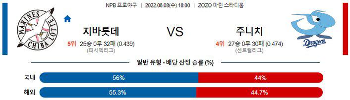 장타력을 앞새워서 전일 경기 6-2 승리로 2연승에 성공한 지바롯데가 선발 싸움에서 우위에 있다. 스즈키 히로시 투수가 커리어 첫 선발 등판에서 5이닝 무실점을 기록했지만 매 이닝 주자를 내보내는 불안 요소가 있었다는 것을 체크해야 한다. 지바롯데 승리 가능성을 추천 한다.