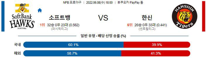 6연승의 상승세를 만들어 낸 한신의 기세를 무시할수 없지만 노히트노런을 기록한 이후 후유증 없이 자신의 몫을 해내고 있는 히가시하마 나오 투수가 선발 싸움에서 우위에 있는 경기다. 또한, 상대 보다 1개 더 많은 8안타를 기록하고 전일 경기에서 0-2, 패배를 당한 소프트뱅크 타선의 각성도 기대되는 타이밍. 소프트뱅크 승리 가능성을 추천 한다.