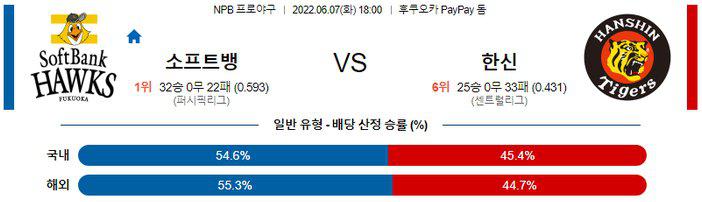 현시점 센트럴리그 평균 자책점 2위를 기록중인 니시 유키 투수와 5연승의 상승세를 만들어 낸 한신의 기세를 간과할수 없지만 니시 유키 투수를 상대로 통산 상대전에서 높은 타율을 기록중인 타자들이 많은 소프트뱅크 타선 이라는 것을 체크해야 한다. 소프트뱅크 승리 가능성을 추천 한다.