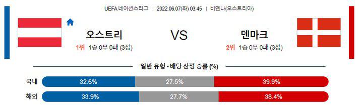 양 팀 주소모두 2022년 들어 치른 3번의 A매치 주소모두 오버(2.5 기준)가 나왔기 때문에 오버(2.5 기준)의 가능성이 높겠다. 또한 랑닉 감독이 새로 부임한 오스트리아도 직전 경기에서 뛰어난 모습을 보여줬지만, 상대인 크로아티아가 로테이션을 돌린 탓도 있었으며 선수 개개인이 만들어낸 득점이 대부분이었다. 팀 압박과 전술이 100%가 아니라는 증거. 어느덧 3년차인 훌만드 감독이 이끄는 덴마크의 승리가 예상된다.