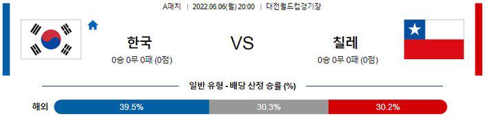 한국이 브라질전을 제외하고 최근 4경기에서 주소모두 언더(2.5 기준)가 나온 점을 고려하면 언더(2.5 기준)의 가능성이 높겠다. 또한 후술하겠지만, 한국의 선전 가능성보다, 칠레의 전력과 컨디션이 매우 떨어지기 때문에 한국의 손을 들어주겠다. 칠레는 주력 선수들 대부분이 이번 일정에서 제외되며, 감독도 데뷔전을 치르는 상황. 여기에 경기 3일 전 한국에 입국해 컨디션을 조절하는데, 조절이 잘 될리가 만무하다. 한국의 승리가 예상된다.