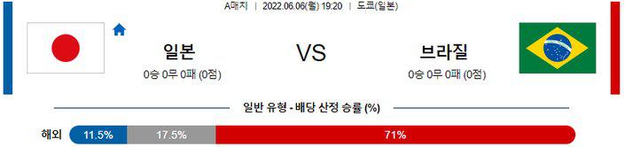 브라질이 최근 4번의 A매치 주소모두 4골 이상 넣는 저력을 발휘하고 있기 때문에 오버(2.5 기준)의 가능성이 높겠다. 또한 후술하겠지만, 브라질은 직전 한국과의 경기에서도 매우 강력한 모습으로 다득점 승리를 기록했다. 일본도 최근 한국과 더불어 아래에서부터의 빌드업 축구를 중요시 하기 때문에 브라질의 강력한 압박에 막혀 어려움을 겪을 것으로 보인다. 브라질의 압승을 예상한다.