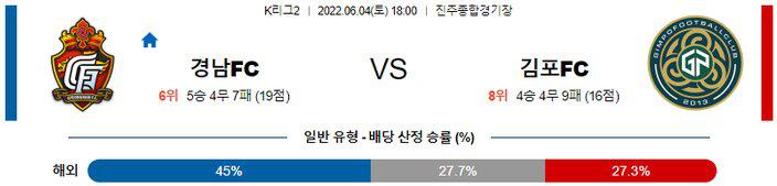양 팀은 최다 실점 1, 2위팀이며 공격적인 기조를 유지한다는 공통점이 있으므로, 다득점 페이스가 될 가능성이 매우 높다. 오버(2.5 기준)는 좋은 선택지가 될 것으로 보인다. 또한 후술하겠지만, 김포는 제대로 된 잔디 위에서 훈련도 하지 못하는 상황으로, 신생팀의 한계를 체감하고 있다. 반면, 경남은 지옥의 5연전을 끝내고 앞으로 하위 레벨들과의 일정이 이어지는 상황. 강팀들과의 연이은 경기로 성적은 썩 좋지 못했지만 경기력이 좋은 편이기 때문에 이번 일정은 경남의 승리가 예상된다.